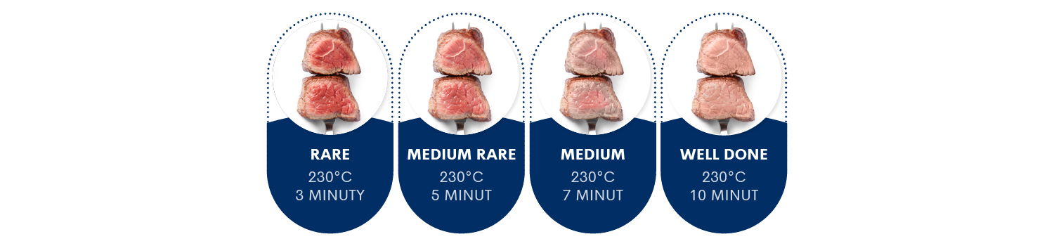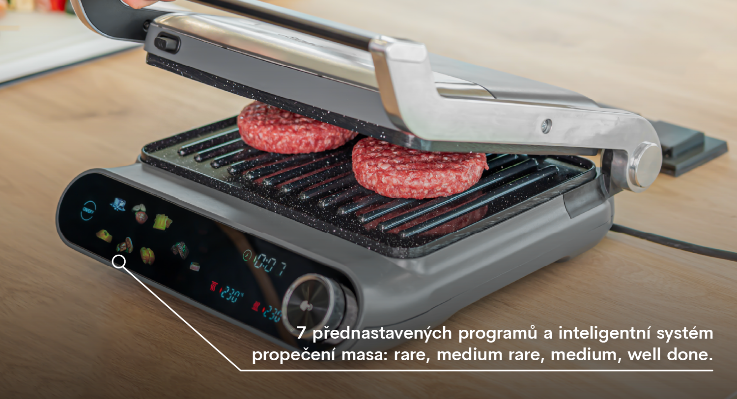 Díky inteligentnímu systému propečení masa dosáhnete vždy ideálního stupně – rare, medium rare, medium nebo well done. Pomocí přehledného dotykového displeje snadno zvolíte jeden ze 7 přednastavených programů - funkce rozmrazovaní, zelenina, toasty, ryba, klobásky, kuře a steak.