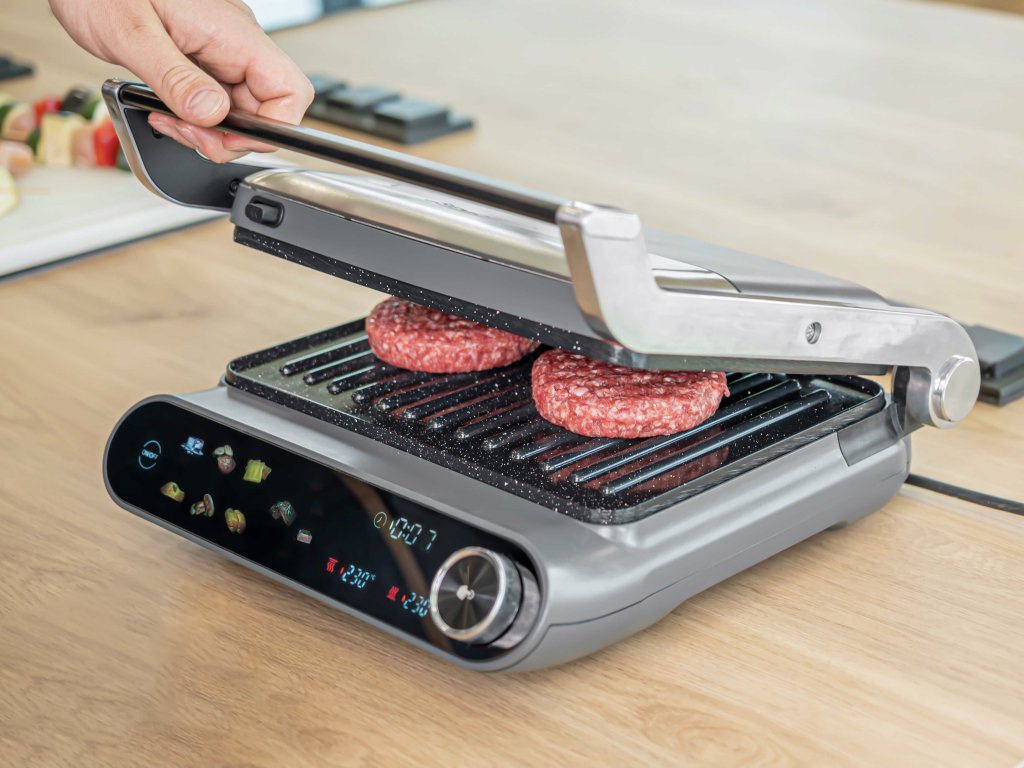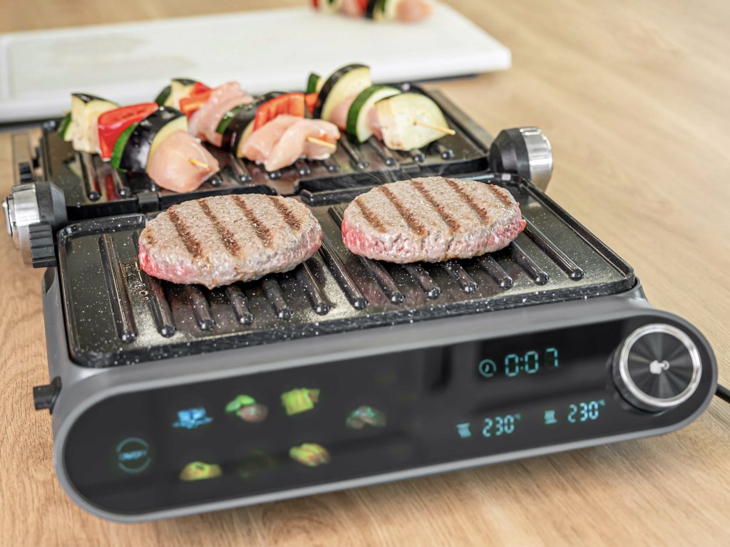 Kontaktní Gril s keramickým povrchem nabízí 7 automatických programů, možnost nastavit teplotu obou grilovacích desek zvlášť (90–230 °C), BBQ funkci – otevření grilu na 180°, a také inteligentní funkci propečení masa s možností výběru stupně propečení – rare, medium rare, medium nebo well done. Ovládání je snadné díky dotykovému panelu s digitálním displejem.