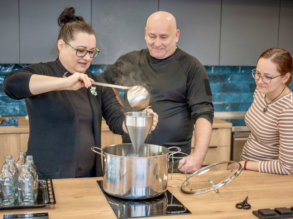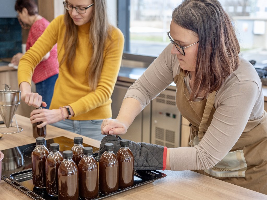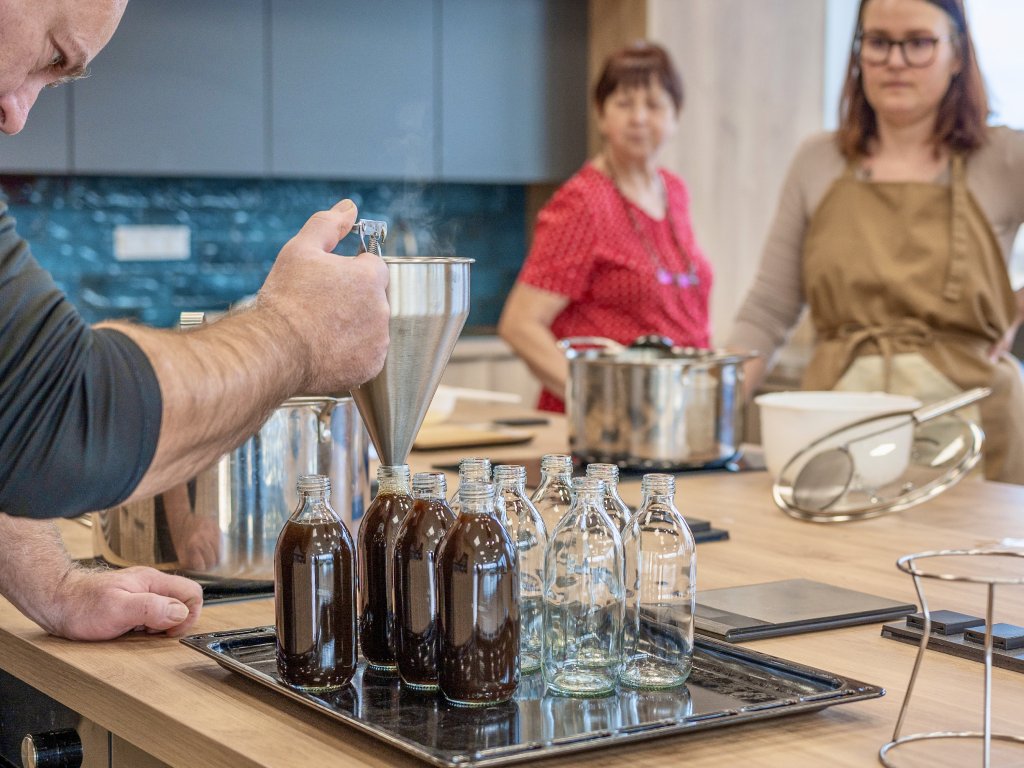 - Každý účastník si zhotoví svoje sirupy od navážení surovin přes uvaření, cezení až po sterilaci.