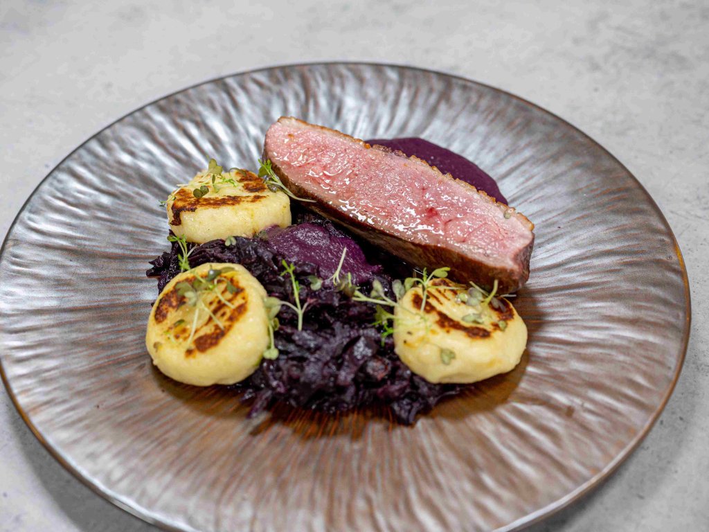 - Pečená kachní prsa s červeným zelím na perníku a bramborovými noky - minutková příprava masa, červené zelí na karamelu bez dušení, práce s bramborovým těstem.