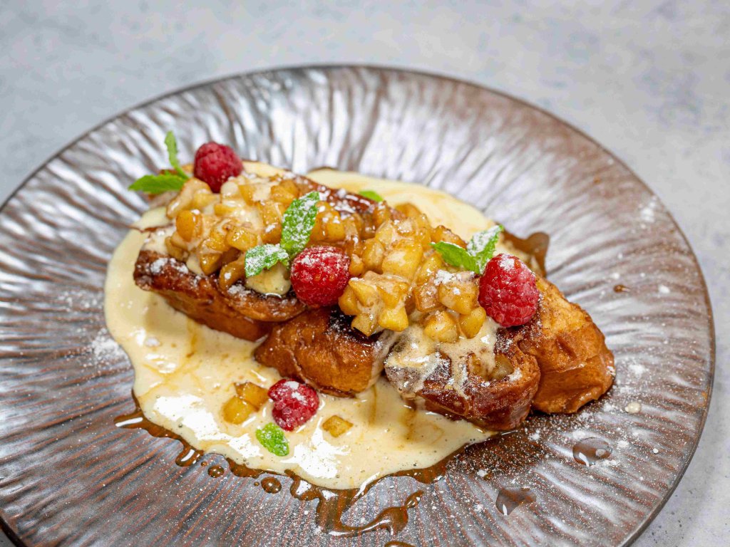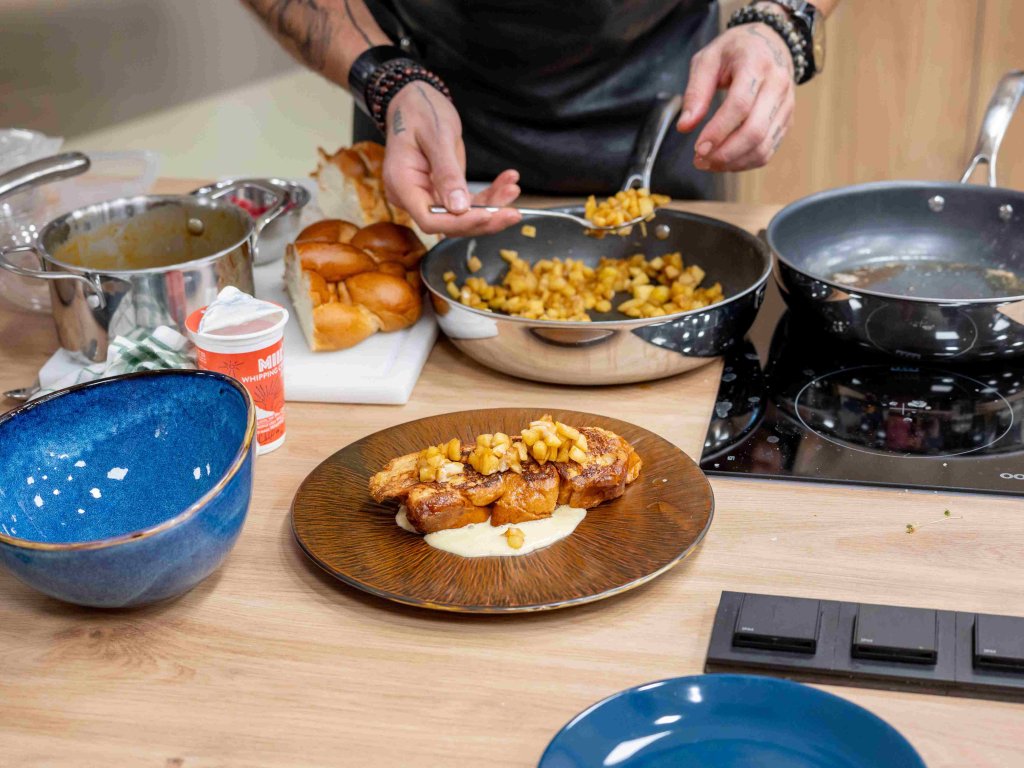 - Dezert ve stylu žemlovky ala French toast - domácí brioche chléb s restovanými jablky se skořicí, příprava creme anglese.