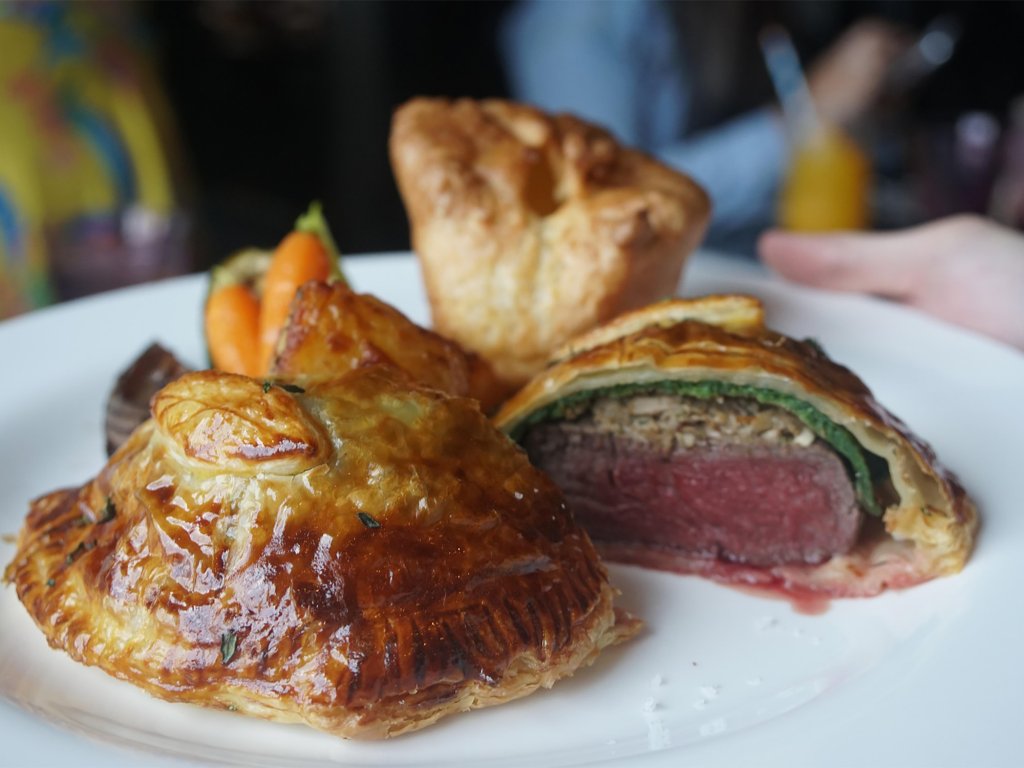 Hlavní chod - kachní prsa (sous-vide), houbová duxelles se slaninnou, máslové listové těsto, demi-glace z vývaru a vína, pastinákové pyré a glazovaná zelenina