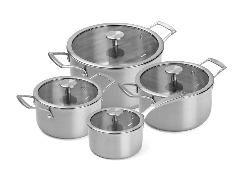 Sada kvalitních nerezových hrnců řady Remoska® Proxima o objemech 1,5 l, 2 l, 3 l a 5 l, včetně skleněných poklic. Hrnce jsou vhodné pro všechny typy sporáků – plynové, elektrické, sklokeramické i indukční. Lze je bezpečně používat také k zapékání nebo dokončení pokrmů v troubě až do 220 °C.