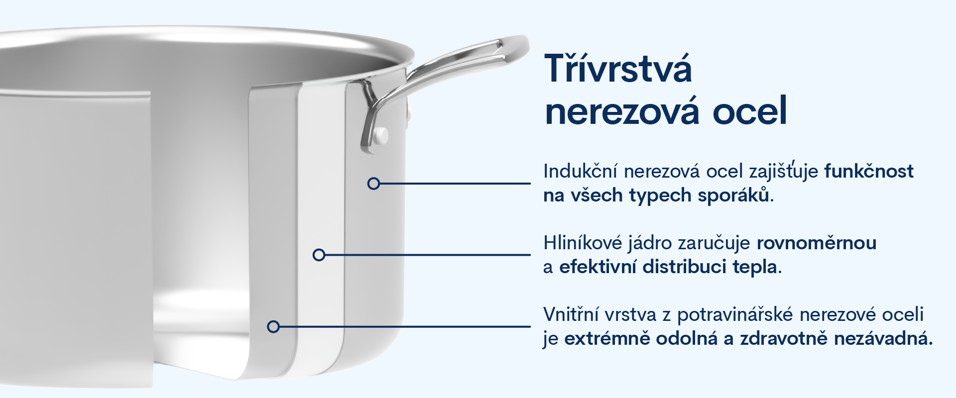 Pánev Remoska® Proxima má třívrstvý nerezový povrch je 100 % non-toxic a zcela zdravotně nezávadný, kombinuje teplotní vodivost hliníku a zároveň odolnost nerezové oceli. Díky dnu o síle 2,5 mm si pánev udržuje stabilní teplotu a bude tak rovnoměrná, rychlá a bez připálení. Údržba je velmi jednoduchá, po vaření můžete nádobí snadno umýt v ruce nebo vložit do myčky. Nádobí je vhodné pro všechny typy sporáků, včetně indukce, a bez obav ho můžete vložit i do trouby až do 220 °C.
