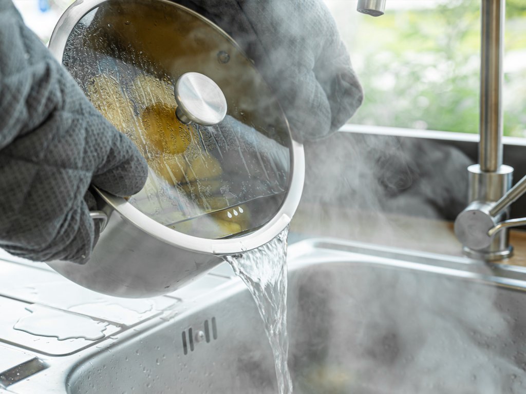 Díky integrovanému odlévacímu okraji a průchodu pro páru můžete vodu pohodlně a bezpečně slévat bez rizika popálení.